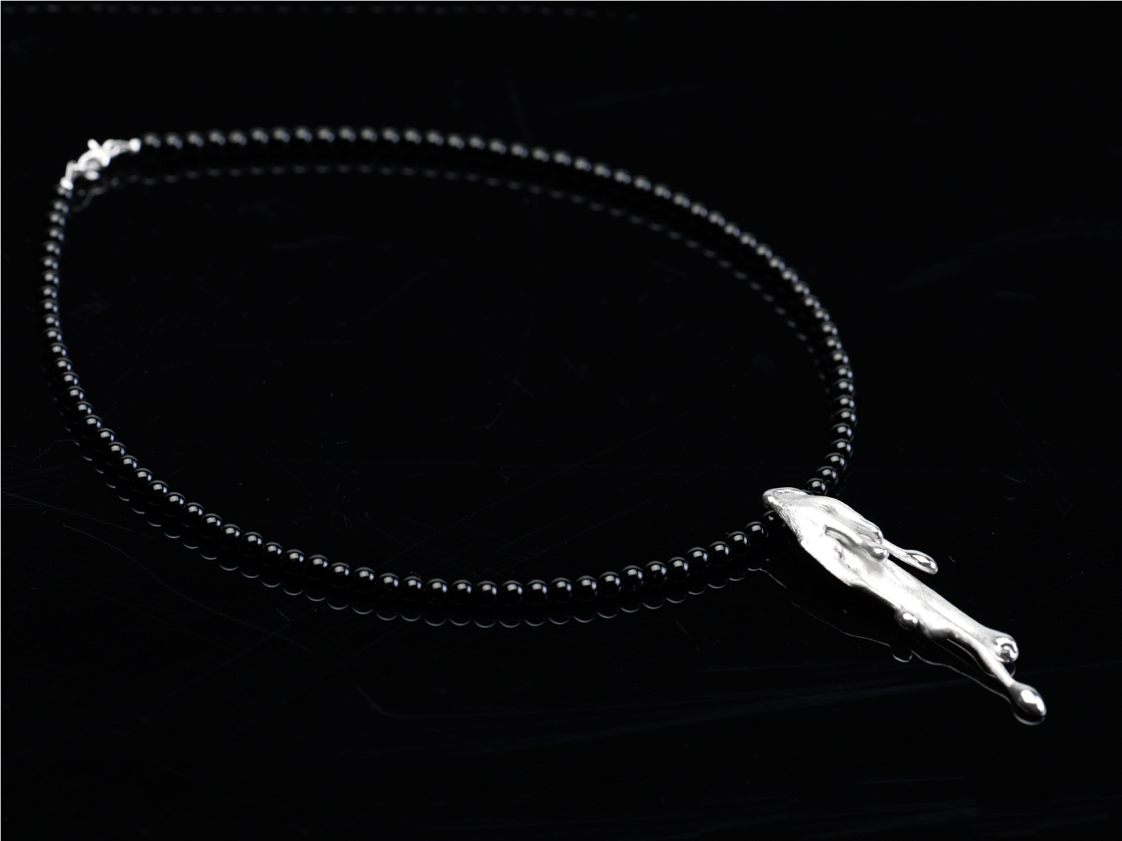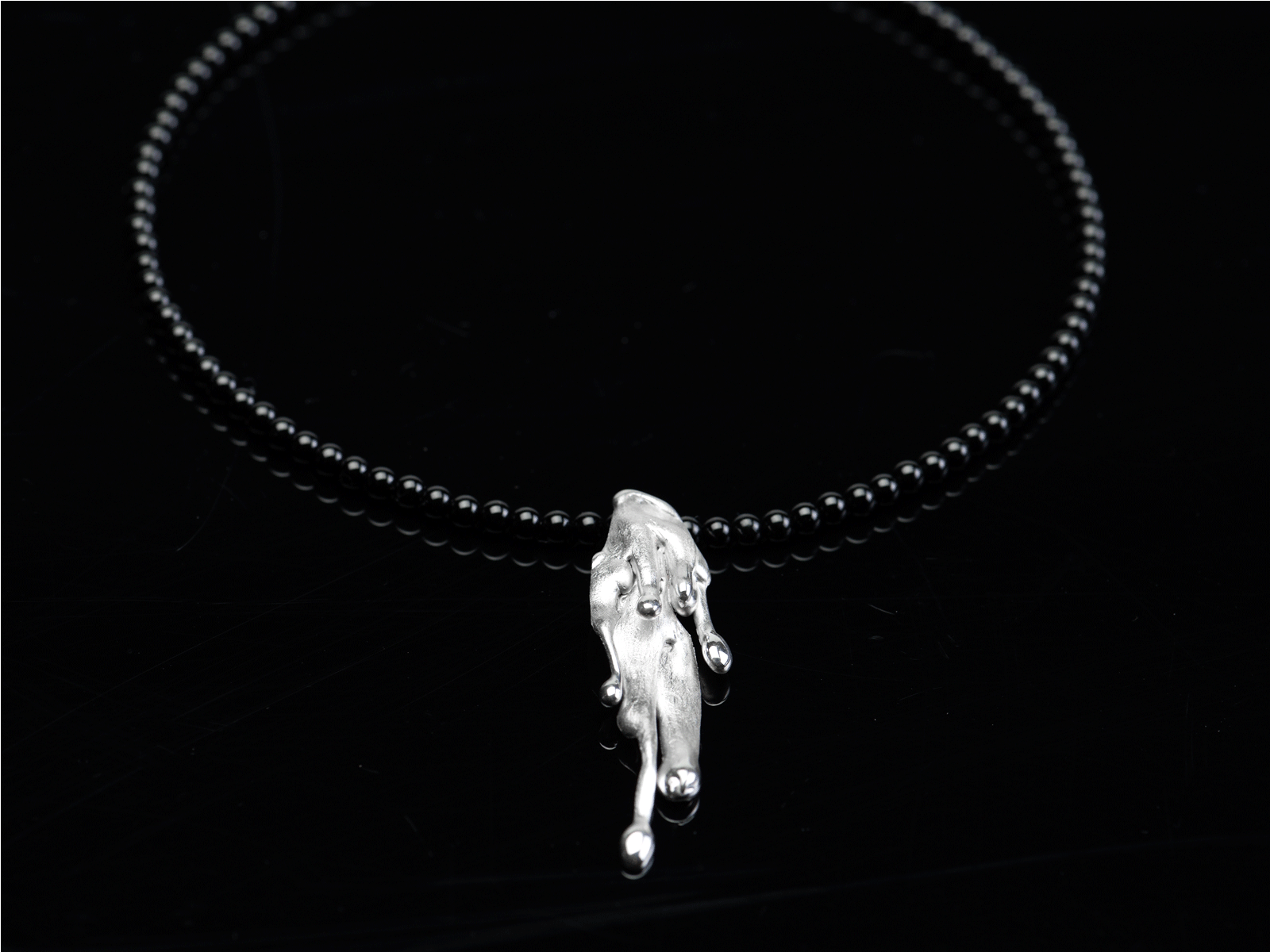 Die Oberfläche der Tropfen wurde poliert, um die Lichtreflexion des flüssigen Wachses aufzugreifen. Der Rest wurde im schönen eismatt bearbeitet. Durch das Zusammenspiel der unterschiedlichen Oberflächen wird das Schmuckstück zum richtigen Blickfang.