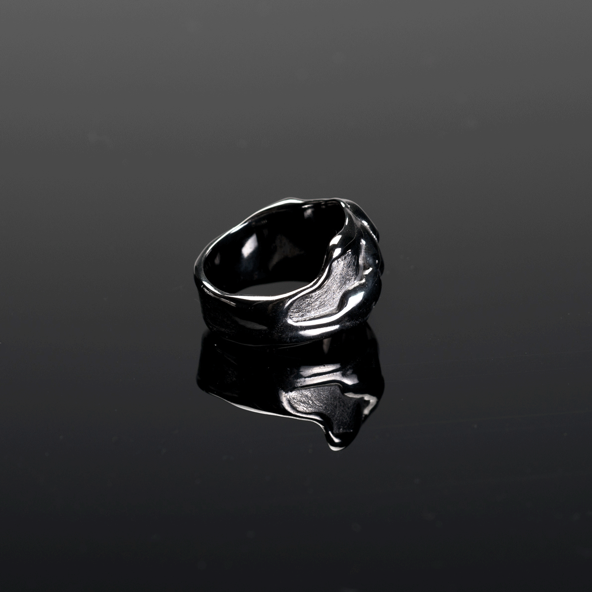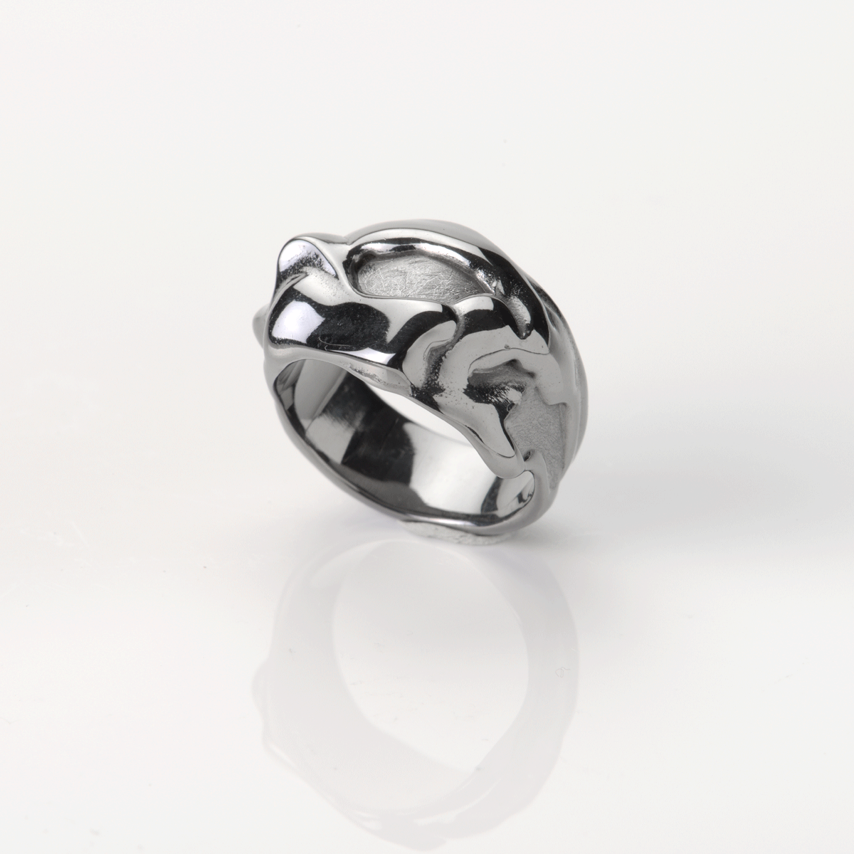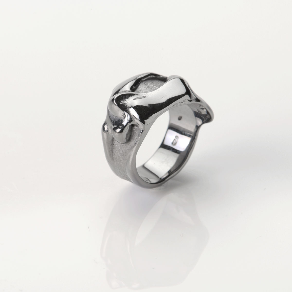 Die Oberfläche der Tropfen wurde poliert, um die Lichtreflexion des flüssigen Wachses aufzugreifen. Der Rest wurde im schönen eismatt bearbeitet. Durch das Zusammenspiel der unterschiedlichen Oberflächen wird das Schmuckstück zum richtigen Blickfang.