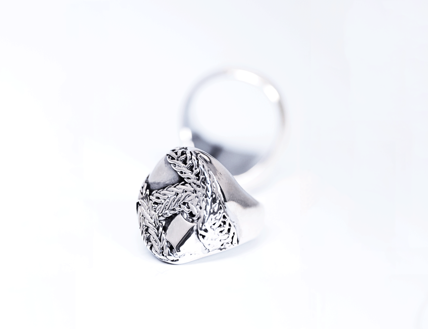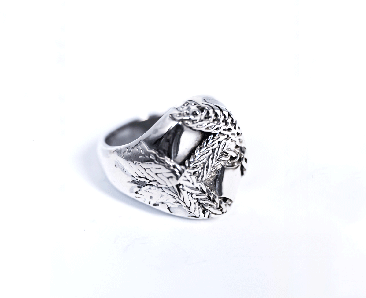 Der Siegelring besteht aus 925er Sterlingsilber und wird von zahlreichen Ketten umrahmt, die detailgetreu von Hand herausgearbeitet werden.